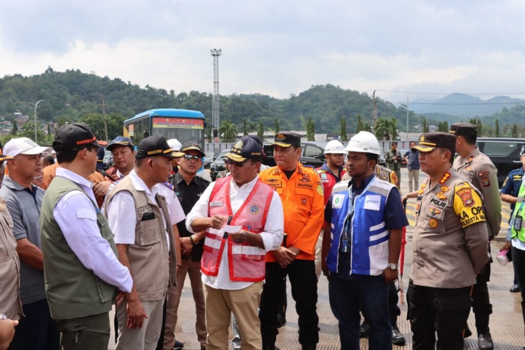 Lampung Selatan (Polda Lampung)— Kapolda Lampung Irjen Pol Helmy Santika bersama Wakapolda Lampung Brigjen Pol Umar Effendi, mendampingi Menko PMK (Menteri Koordinator Bidang Pembangunan Manusia dan Kebudayaan) Prof. Dr. Muhadjir Effendy dan Kabaharkam Polri Komjen Pol Fadil Imran dalam kegiatan pantauan arus balik lebaran 2023 di pelabuhan penyeberangan Bakauheni Lampung Selatan, Selasa (25/4/2023).